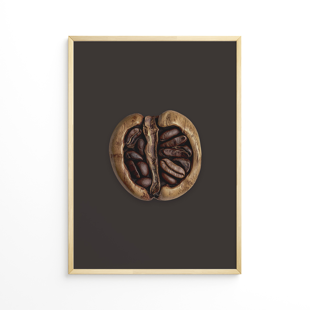 Kaffens Hjerte er en stilfuld og stemningsfuld plakat, der forener æstetik og passion i ét enkelt motiv. Med sit smukke, hjerteformede snit af en kaffebønne formidler plakaten en kærlighedserklæring til dagens vigtigste ritual – kaffen.