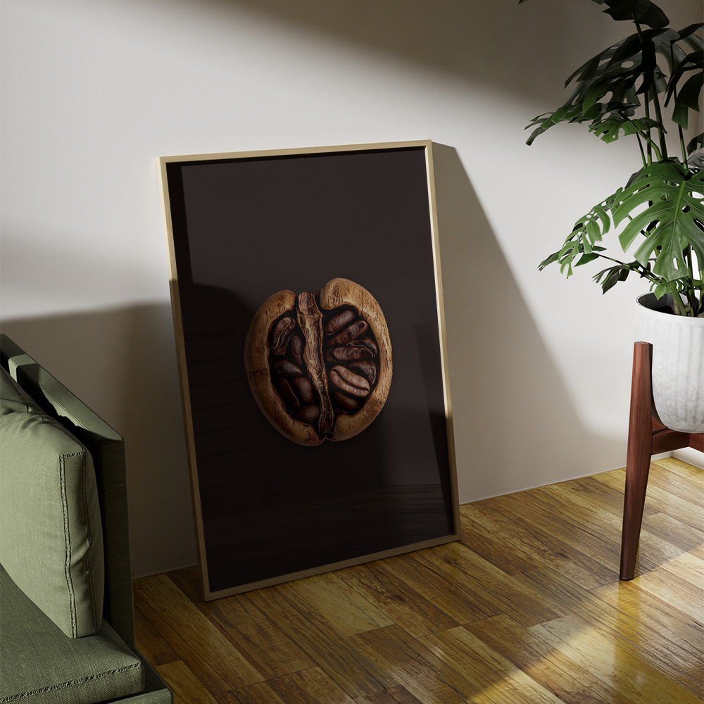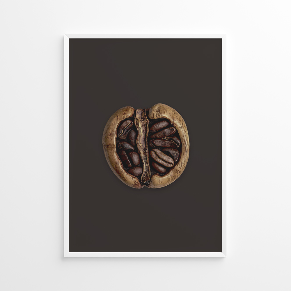 Motivet emmer af varme og dybde, hvor de jordnære brune nuancer står i smuk kontrast til den mørke baggrund. Det skaber en rolig og raffineret stemning, der passer perfekt ind i både moderne og klassisk indretning. Hæng den i køkkenet, over kaffebaren, i stuen eller på kontoret – alle steder hvor du nyder en pause og værdsætter de små øjeblikke.