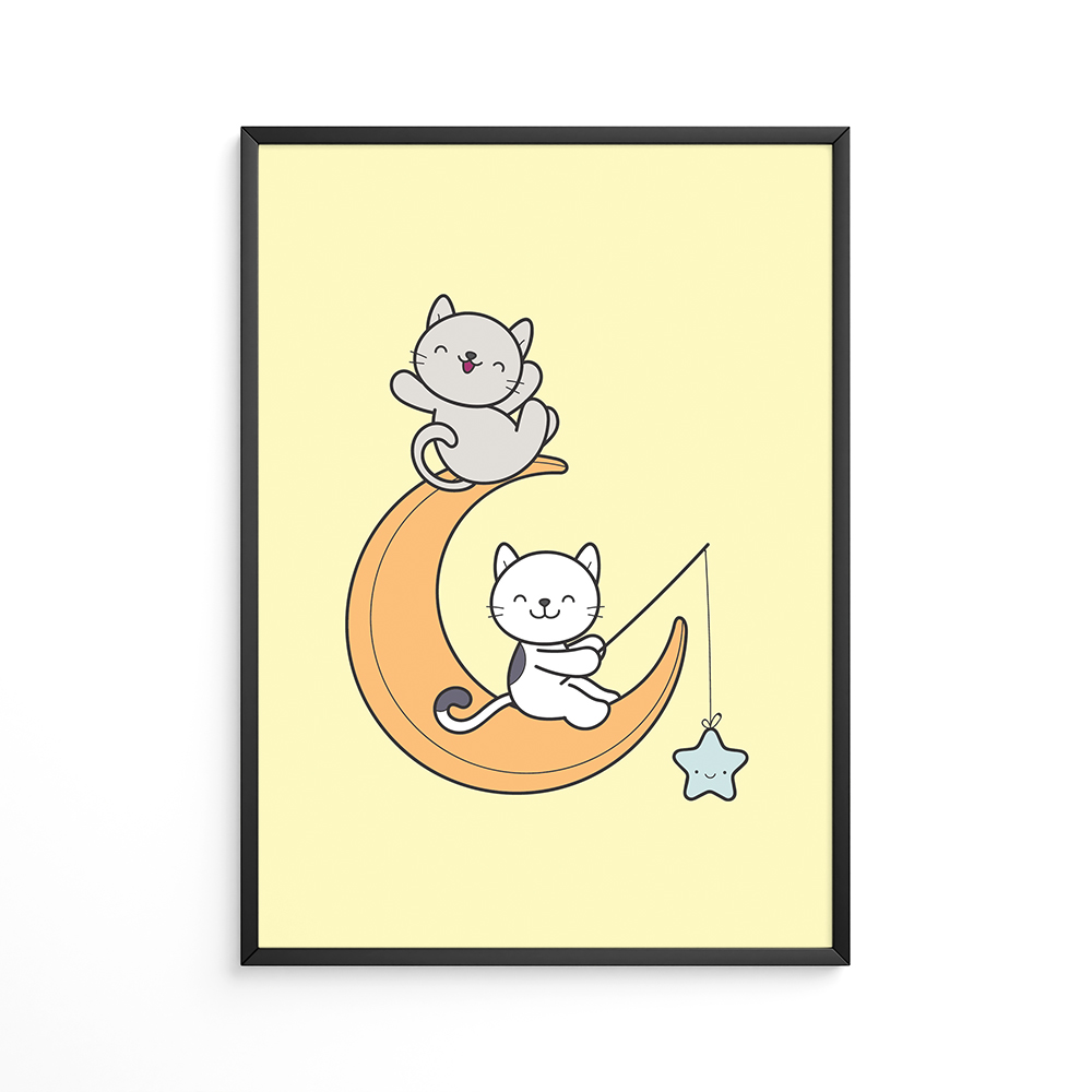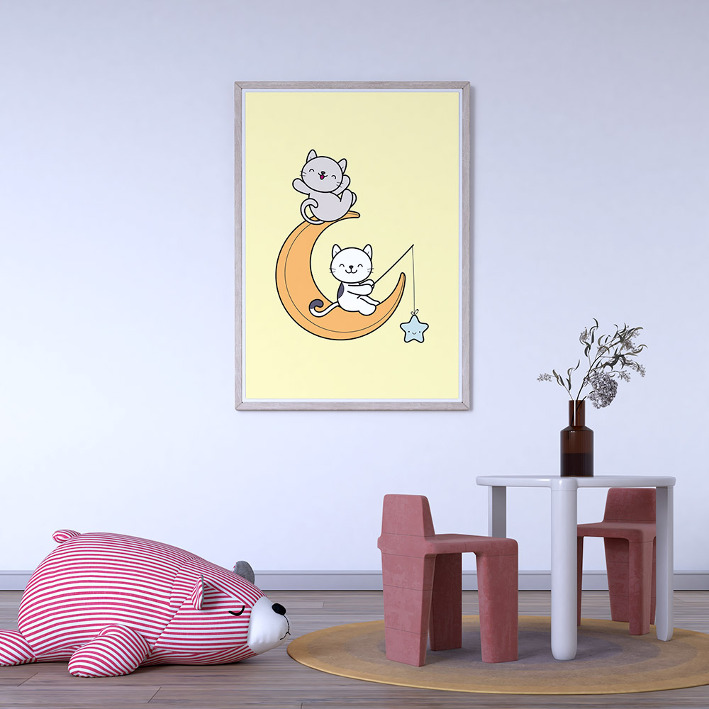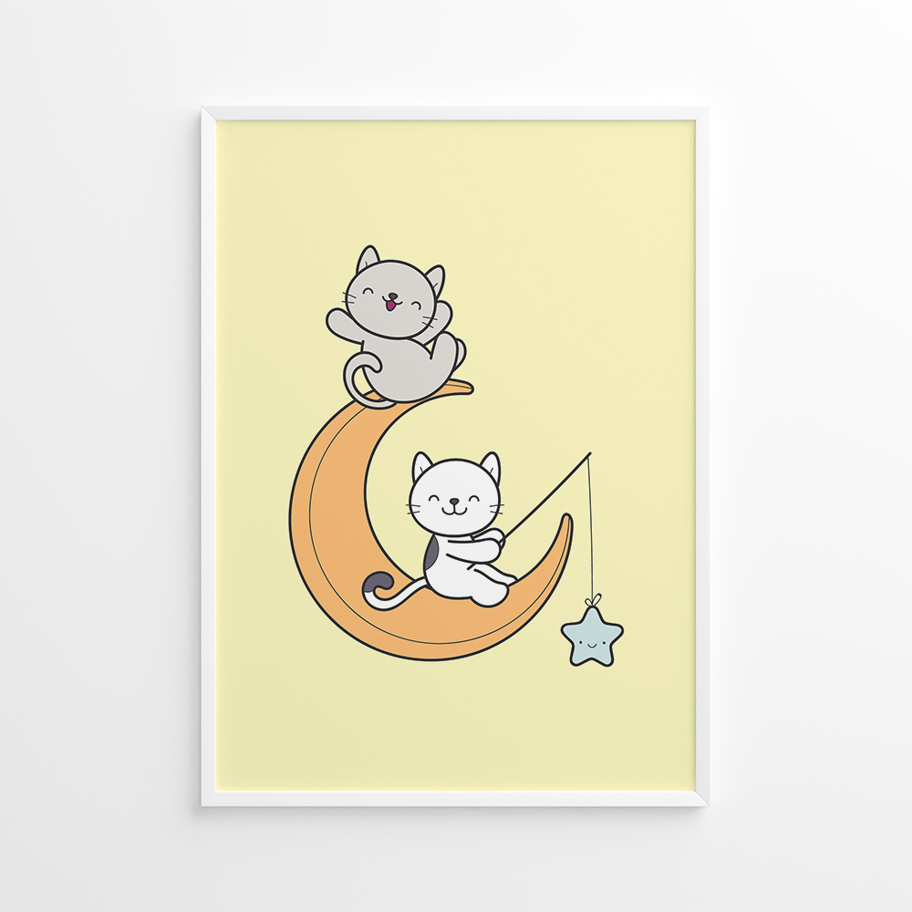 Lad fantasien få frit løb med denne magiske plakat, der bringer smil og varme til ethvert rum. “Venner på Månen” viser to nuttede katte, der hygger sig under stjernerne – den perfekte blanding af leg og drømme. Med dens bløde farver og charmerende design er plakaten ideel til børneværelset, stuen eller som gave til dyreelskeren.